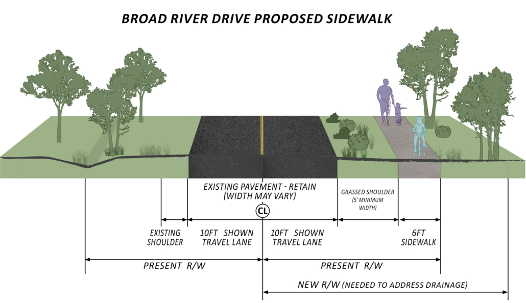 The following exhibit shows the proposed 6′ sidewalk along Broad River Drive.