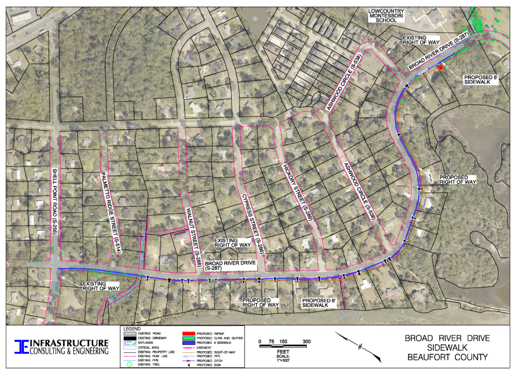 Beaufort County proposes to construct a new 6′ sidewalk on Broad River Drive from Shell Point Road to the Lowcountry Montessori School. This sidewalk is approximately 0.7 miles long and will improve bicycle and pedestrian safety by providing a separate facility from the roadway The proposed design will require new right of way.